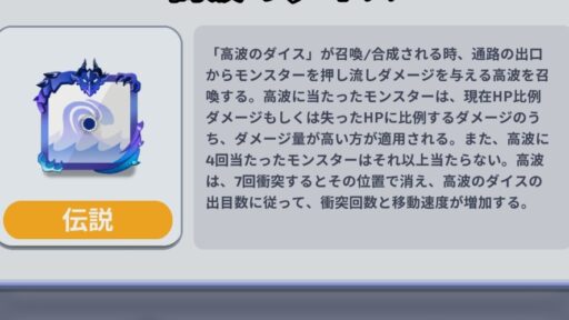 召喚、合成の際に高波を出すダイス!比例ダメージなので敵が強くなってもその威力は変わらない。現シーズンでは最強デッキの一つとして構成される。
