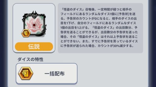 一定時間たつと相手のダイスの出目を一つ下げるダイス!終盤に強さを発揮し、相手のデッキ次第では確実に勝てるダイス。